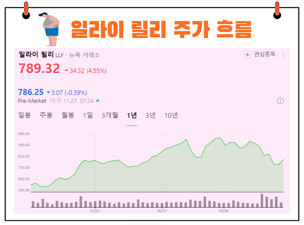 일라이릴리의 주가는 비만치료제 성공에 힘입어 2023년부터 상승세를 이어갔으나, 2024년 들어 성장 둔화 우려로 하락세로 전환되었습니다.