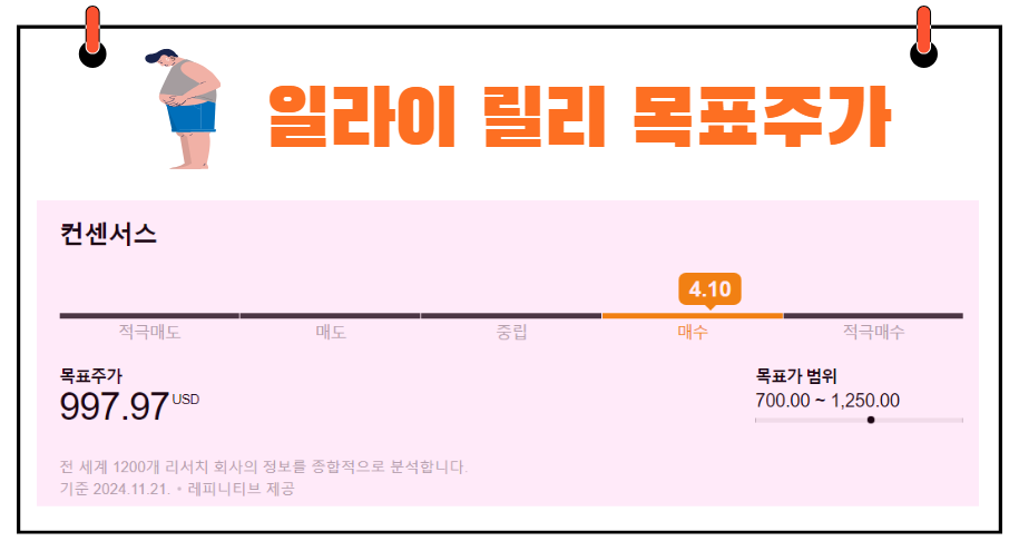 일라이 릴리에 대해 전 세계 1200개 리서치 회사의 정보를 종합한 목표주가 평균은 997.97달러입니다.