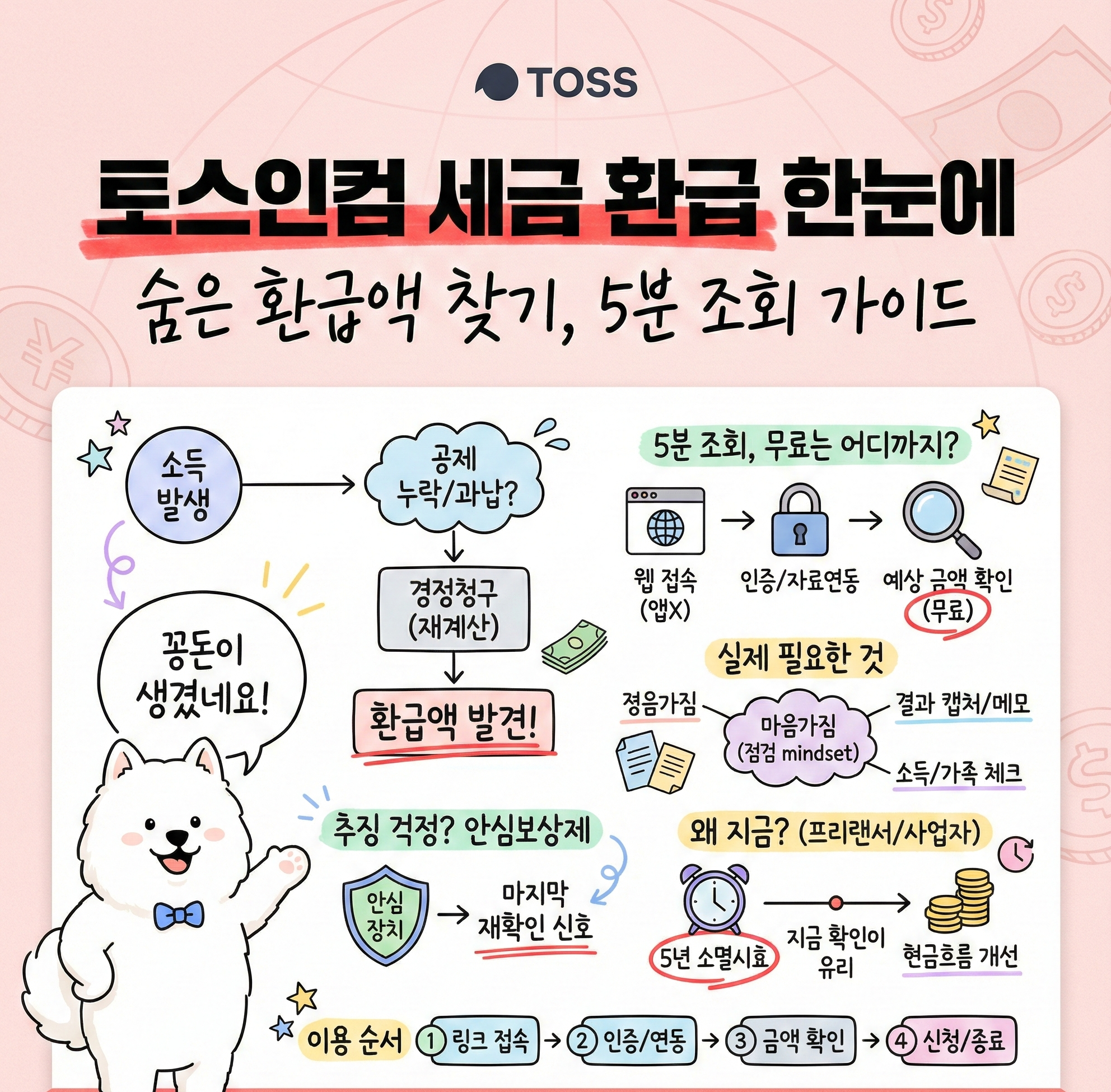 토스인컴 웹에서 세금 환급 가능 금액을 빠르게 조회해봤습니다. 숨은 환급액이 생기는 이유부터 추징(추가 납부) 유의사항, 그리고 5년 소멸시효까지 한 흐름으로 정리해둘게요.