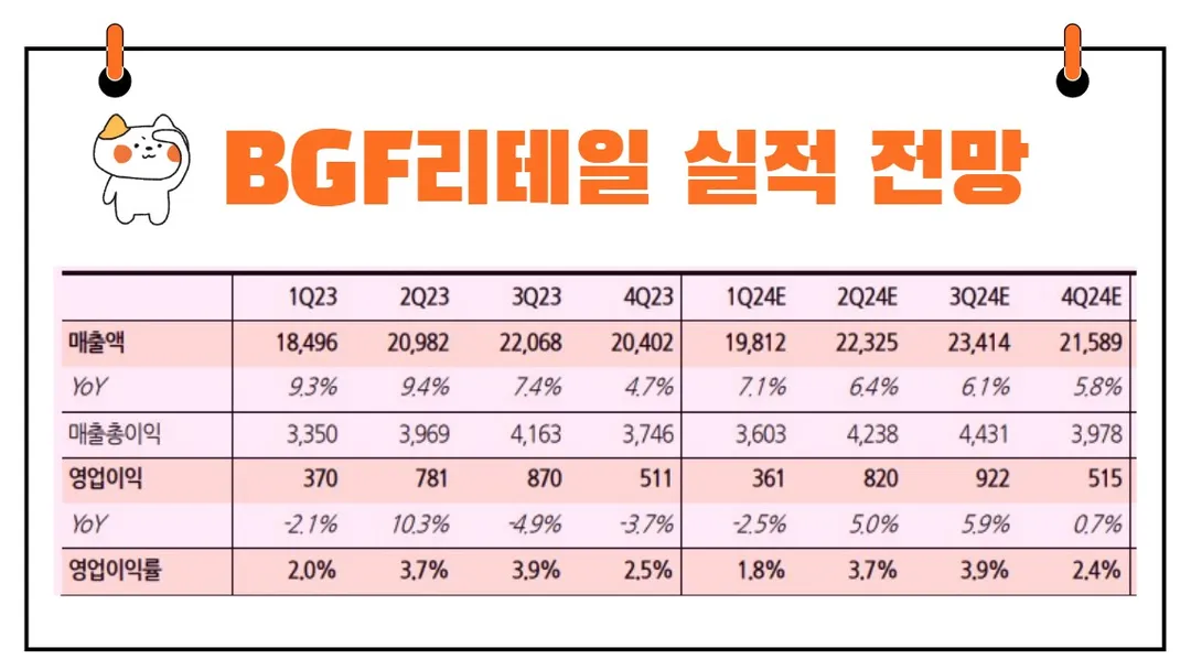 2024년 1분기, 주요 편의점 기업인 BGF리테일과 GS리테일의 성적표는 시장의 기대를 다소 못 미치는 모습을 보였습니다. BGF리테일의 경우, 매출액은 1.98조 원을 기록하며 전년 동기 대비 7.1% 증가했지만, 영업이익은 361억 원으로, 예상치 390억 원에 미치지 못했습니다. 이는 2.5% 감소한 수치입니다. 한편, GS리테일은 매출액 2.84조 원(+5.3% YoY)과 영업이익 677억 원(+9.5% YoY)을 달성했으나, 여기에도 716억 원이라는 시장의 기대를 하회했습니다.