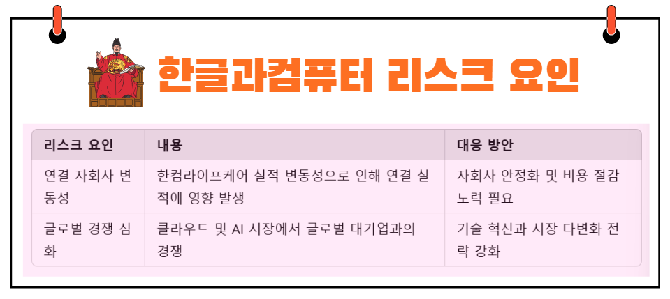 연결 자회사 실적 변동성: 한컴의 연결 자회사인 한컴라이프케어의 실적이 변동성을 보이고 있습니다.