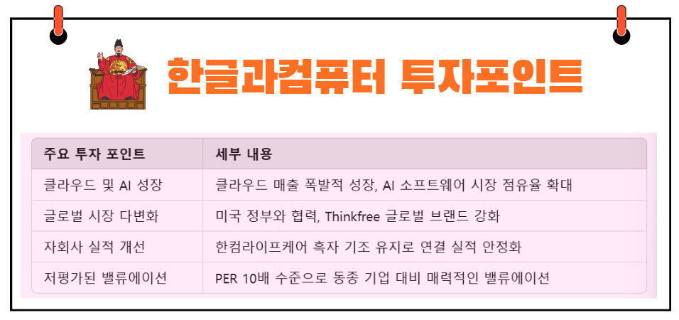 한글과컴퓨터는 안정적인 본업 실적과 더불어 클라우드와 AI 사업 확장으로 미래 성장 가능성을 보여주는 기업입니다.