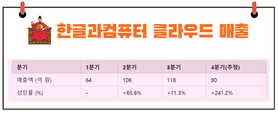 특히 클라우드 매출의 증가율은 눈에 띄는 수준으로, 1분기 64억 원, 2분기 106억 원, 3분기 118억 원으로 지속적인 성장세를 보였습니다.