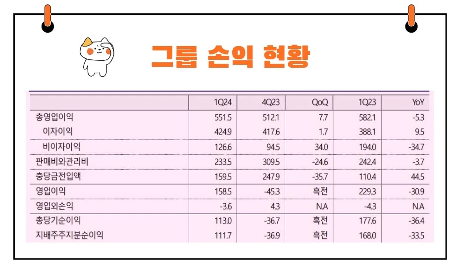 이는 주로 PF(프로젝트 파이낸싱)와 같은 대손충당금 증가 때문인데, 이는 잠재적 손실에 대비한 선제적 조치로 해석될 수 있습니다.