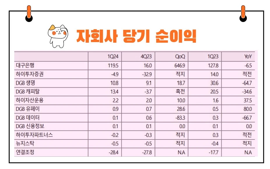2024년 1분기, DGB금융지주는 연결 기준으로 1,119억 원의 당기순이익을 기록했습니다.